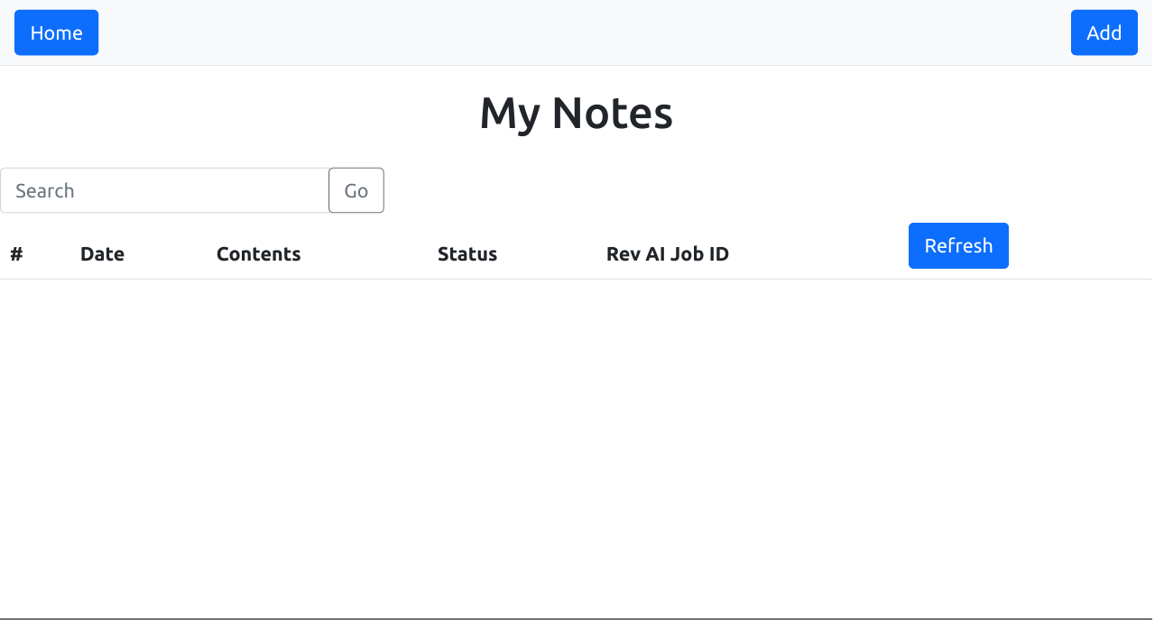 Click the "Add" button in the top right corner. You will be redirected to a new page and the browser will prompt for access to the system microphone. Grant this permission, then click the "Start recording" button. Speak and click "Stop recording" once done. Your audio will be uploaded and you should be redirected back to the index page, where you should see your voice note listed with status "In progress".