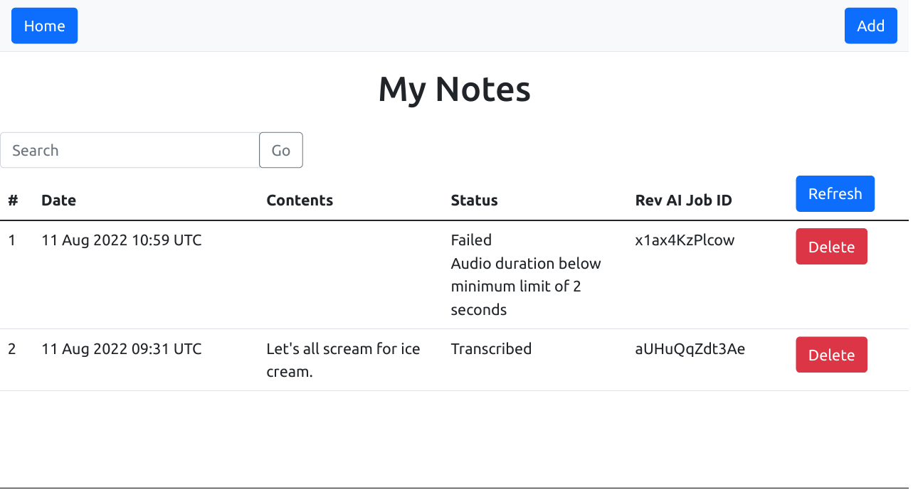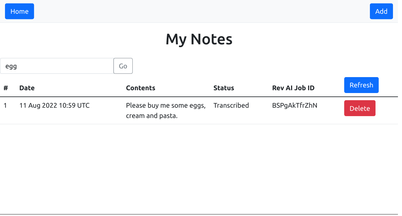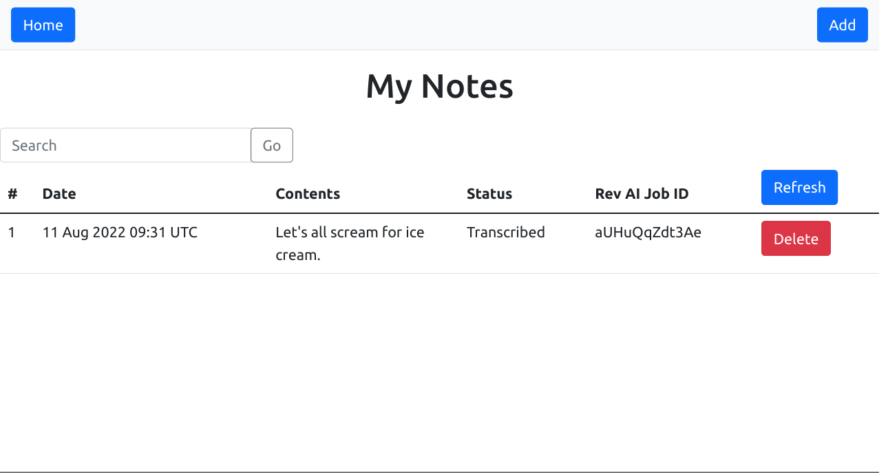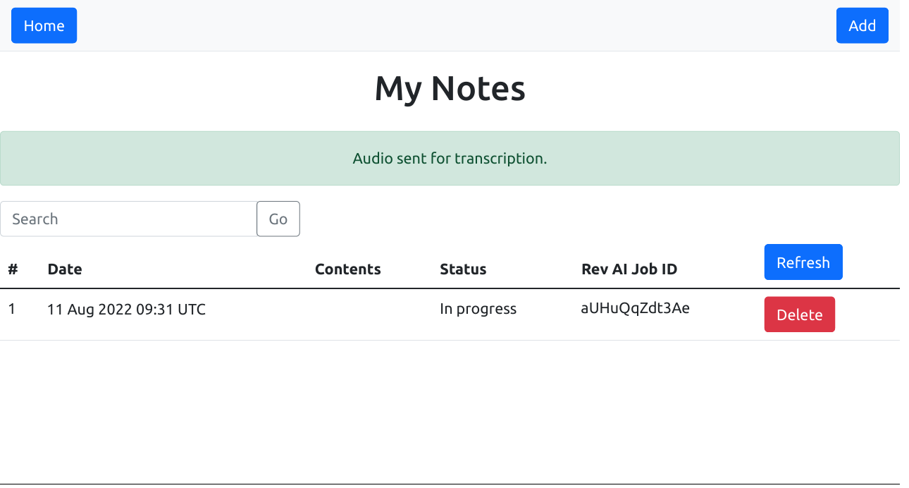views/index.twigto support an additional "Delete" button for each displayed transcript and a newdeletedstatus message, as below.{% extends "layout.twig" %} {% block content %} <!-- ... --> {% if status == 'deleted' %} <div class="alert alert-success text-center" role="alert">Note deleted.</div> {% endif %} <!-- ... --> <table class="table"> <!-- ... --> <tbody> {% for item in data %} <tr> <td>{{ loop.index }}</td> <td>{{ item.ts|date("d M Y h:i e") }}</td> <td class="text-wrap" style="max-width: 150px;">{{ item.data }}</td> {% if item.status in ['JOB_UPLOADED', 'JOB_TRANSCRIPTION_IN_PROGRESS'] %} <td>In progress</td> {% elseif item.status == 'JOB_RECORDED' %} <td>Recorded</td> {% elseif item.status == 'JOB_TRANSCRIPTION_SUCCESS' %} <td>Transcribed</td> {% elseif item.status == 'JOB_TRANSCRIPTION_FAILURE' %} <td class="text-wrap" style="max-width: 150px;">Failed <br/> {{ item.error }}</td> {% endif %} <td>{{ item.jid }}</td> <td><a class="btn btn-danger" href="{{ url_for('delete', { 'id': item._id }) }}" role="button">Delete</a></td> </tr> {% endfor %} </tbody> </table> {% endblock %}Note that the generated hyperlink for each "Delete" button will point to a route named