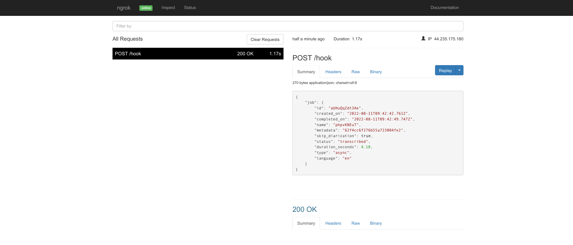 When the transcript is ready, Rev AI will notify the webhook URL. If you are using a public URL, you will be able to see this activity in the Web server logs. Alternatively, if you are using ngrok, you will be able to see this activity in the ngrok dashboard, as shown below: