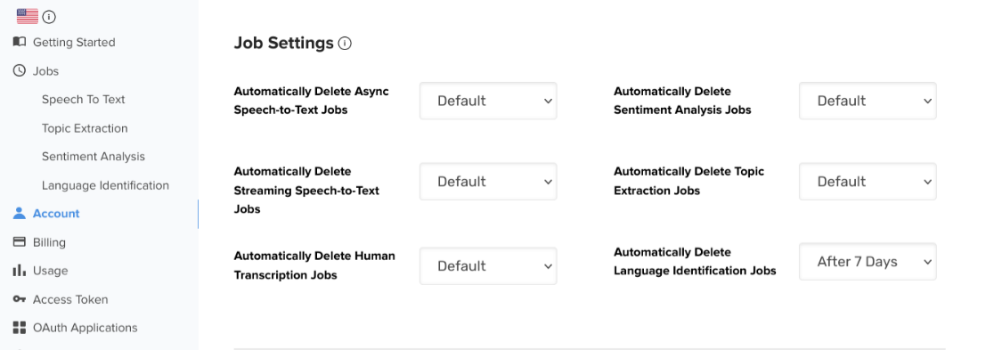 Once this setting is enabled, Rev AI will delete each job and its associated data shortly after the specified time period elapses.